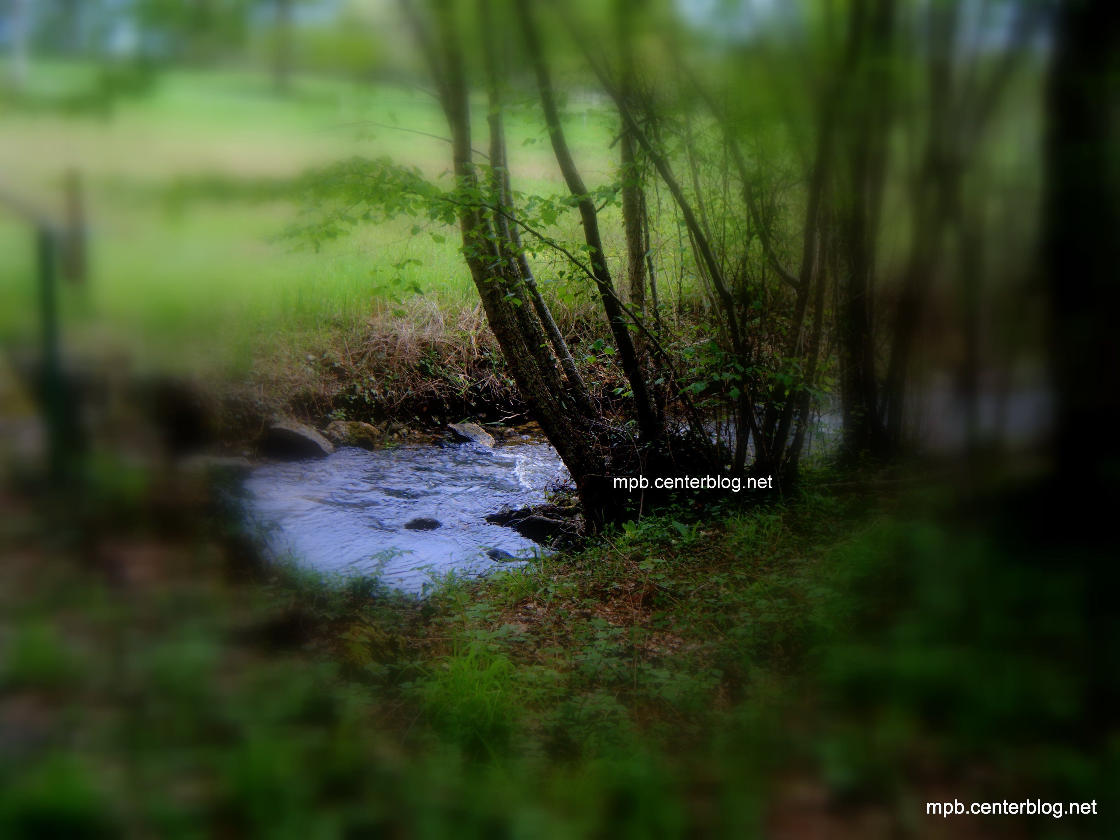 Sous les ombres feuillues d'une verdure, au plus près du ruisseau, le jour se mire dans sa douce cascade timide, d'eau.