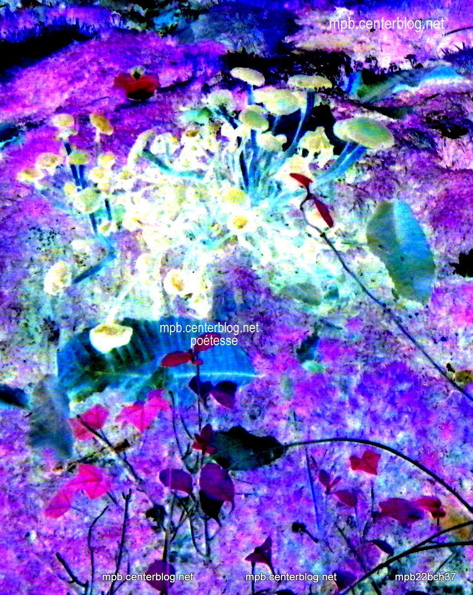 De ce manteau d'effets diffusé aux aguets d'un certain repentir, d'une douce phrase laissant traîner son agrément d'une élégance sourde de désir, l'été s'en est allé tout miraculeusement se cacher aux bras d'un automne qui sonne sous octobre, en cette merveilleuse veillée, au feu de bois se mirant de châtaignes grillées.